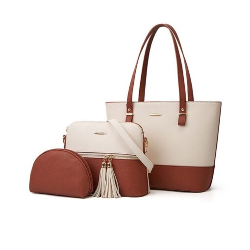 3 Pieces Purse Set Tote Satchel Hobo Handbags For Women Brown/White
