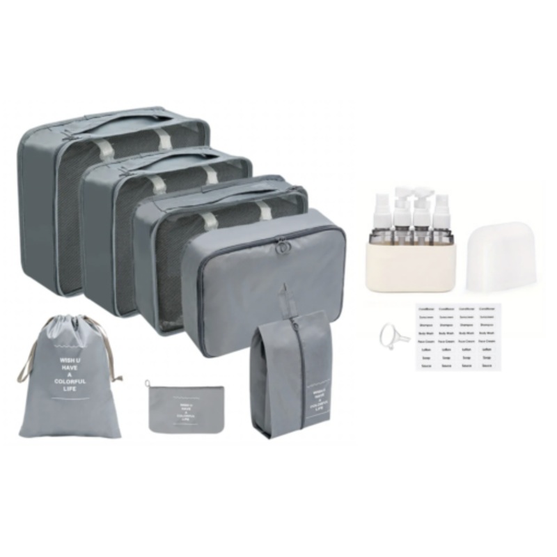 TEEcoWlWPkBmw7 Piece Ultimate Travel Organiser Set with 4-in-1 Travel Bottle Set Grey