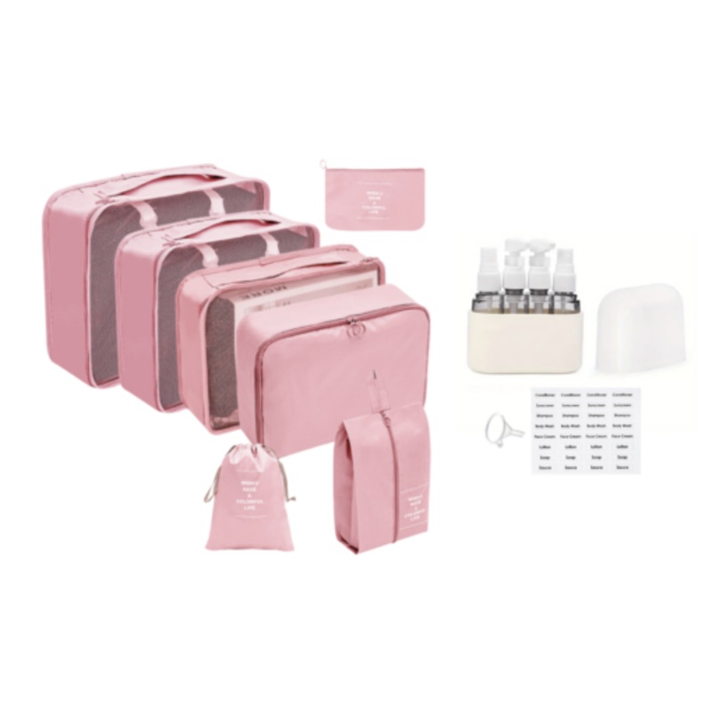 TEEBJyM4IVBNN7 Piece Ultimate Travel Organiser Set with 4-in-1 Travel Bottle Set Pink