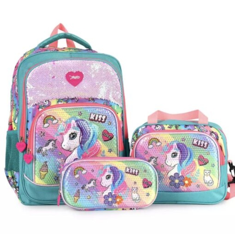 TEETXNcq50IUHNew Sequins Unicorn 3D 3 PCS Set Kids School Backpack Green