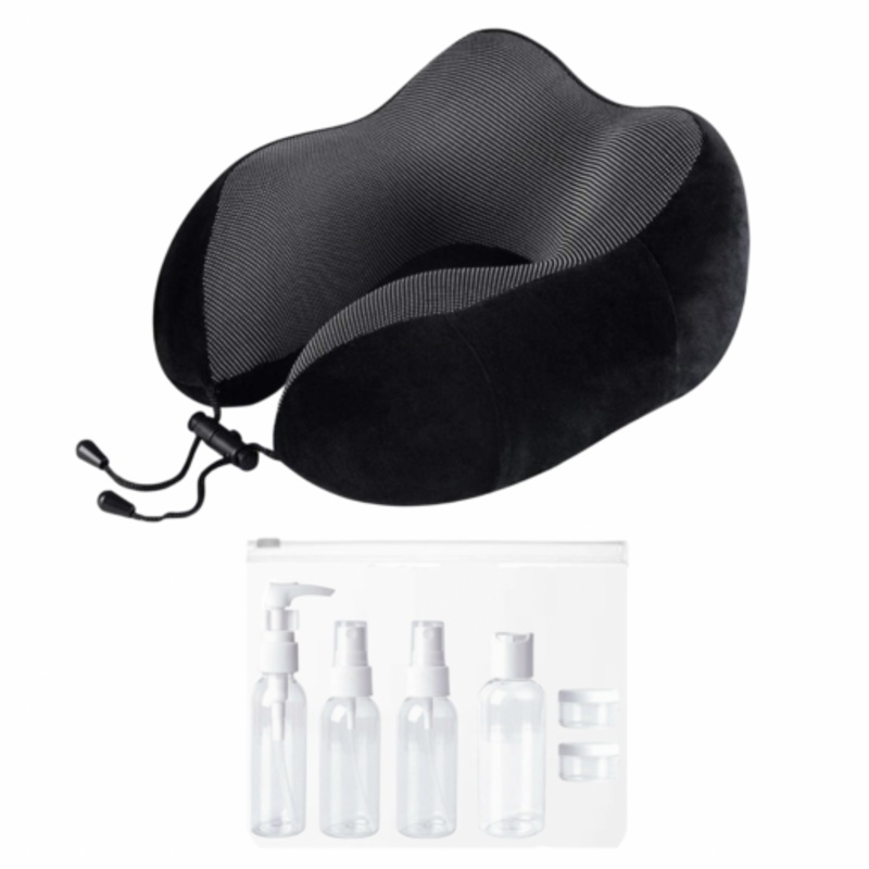 Premium Memory Foam Neck Pillow plus Travel Bottle Set Black