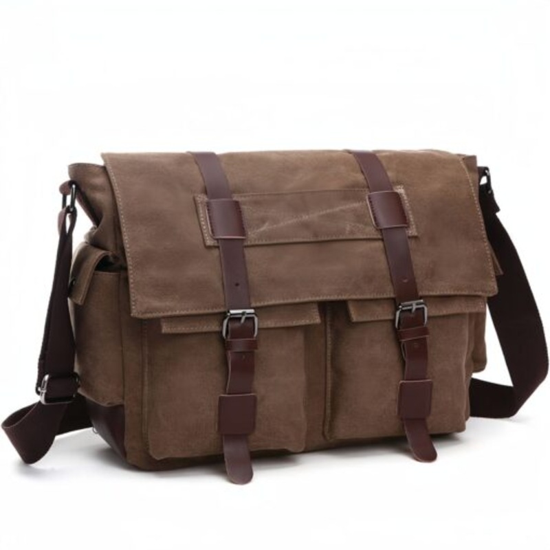 Retro Military Mens Canvas Crossbody Bag Leather Canvas Laptop Bag brown